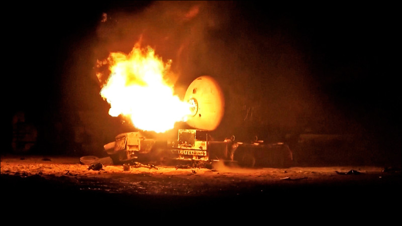 拉斯伊薩燃料港一座油槽在空襲後猛烈燃燒。(路透)