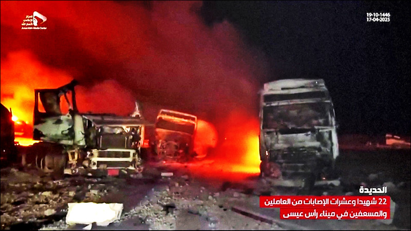 美軍空襲由青年運動掌控的拉斯伊薩燃料港,港口多輛汽車被炸毀。(法新社)
