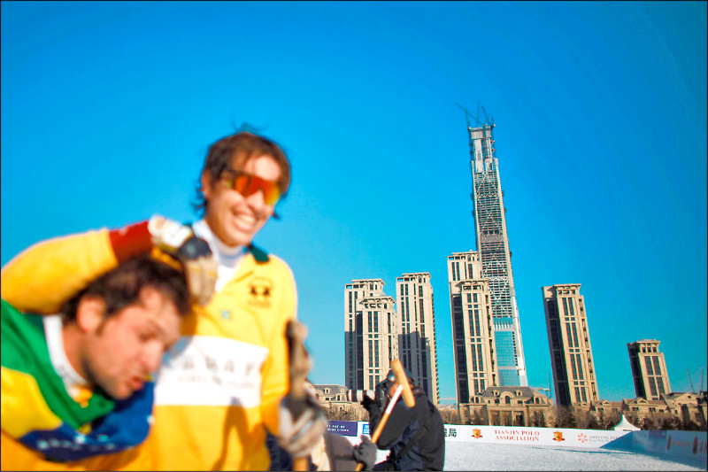 位於中國天津的世界最高爛尾樓「高銀金融117大廈」,停建10年後可望復工。圖為2015年2月8日在天津參加世界盃雪地馬球賽的選手,與該棟大樓合影。(法新社)