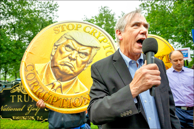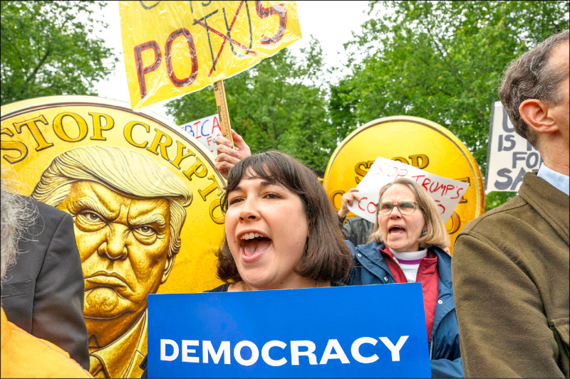質疑川普利用數位貨幣牟利 場外百人抗議