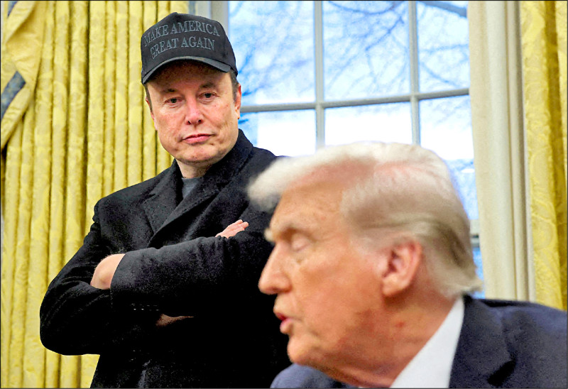 協助美國總統川普(右)大砍聯邦政府勞動力與開支的全球首富馬斯克(左)27日表示,對所謂「大又美法案」感到「失望」,因為該法案將增加、而非減少預算赤字,破壞原本由他主導「政府效率部」的努力。(路透檔案照)