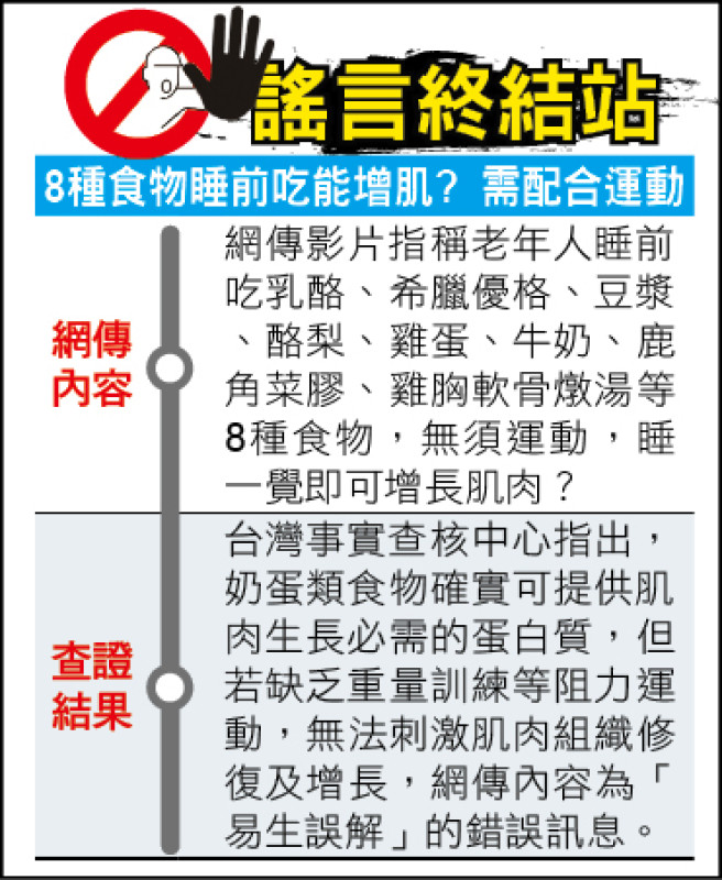 查證結果:台灣事實查核中心指出,奶蛋類食物確實可提供肌肉生長必需的蛋白質,但若缺乏重量訓練等阻力運動,無法刺激肌肉組織修復及增長,網傳內容為「易生誤解」的錯誤訊息。