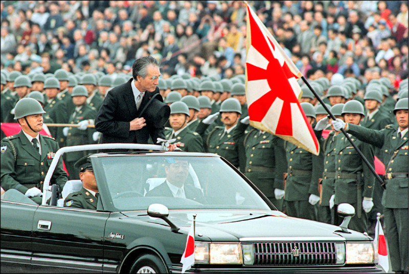 1995年發表終戰50週年「村山談話」的日本前首相村山富市,17日因年老衰竭辭世,享耆壽101歲。左圖為時任首相村山富士在1994年10月於東京校閱日本自衛隊。(美聯社檔案照)