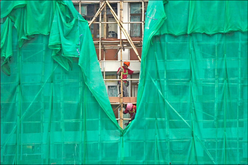 圖為工人4日正在沙田區的穗禾苑移除竹製棚架上的棚網。穗禾苑是香港居者有其屋計劃第一期的首個屋苑,於1980年落成。(路透)