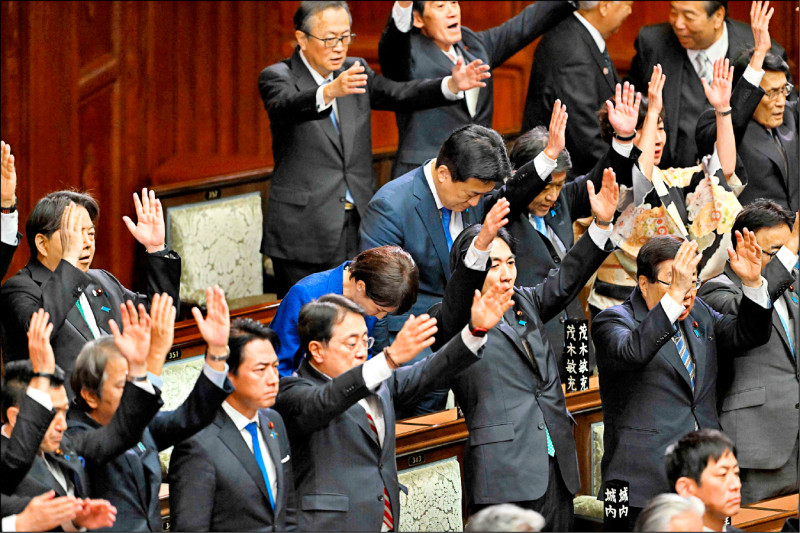 在宣布解散眾議院重新舉行大選後,國會議員舉手三呼萬歲,首相高市早苗(中)則向會場鞠躬行禮。(法新社)