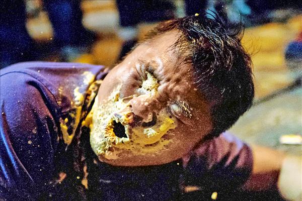 佔中人士於十七日晚間再攻旺角、重奪遭清場的佔領區,大批示威者與警方激烈衝突,港警出動胡椒噴霧及警棍對付佔中者,連在現場採訪的媒體記者也「中椒」、痛苦不堪。(法新社)