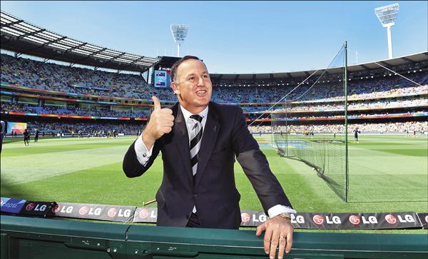 紐西蘭總理凱伊為了看國家板球隊比賽,二十九日選擇缺席新加坡前總理李光耀的葬禮。圖為冠軍戰前,凱伊比出大拇指向球迷打招呼。(法新社)