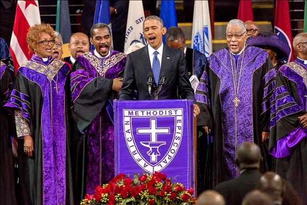 歐巴馬在發表追悼詞接近尾聲時,突然唱起聖歌「奇異恩典」,他身後的牧師隨即起身加入,風琴手也立即配樂,聖詩班與在場數千名出席者也引吭高歌。