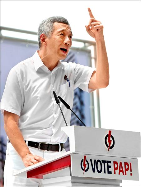 新加坡總理李顯龍八日在造勢活動上發表演說,本次大選將是他主政以來最嚴酷的考驗。(歐新社)