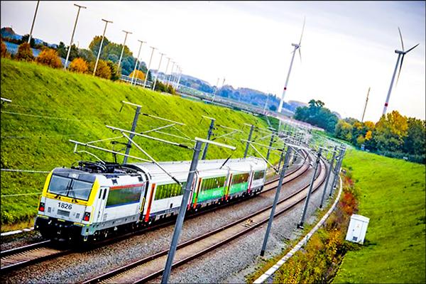 比利時第一列使用風力發電的火車(見圖,取自網路)二十四日正式營運,而國內已有半數鐵路使用風力供電的荷蘭,也打算進一步擴大風力使用,在二○一八年前達成鐵路百分之百使用風力發電的目標。