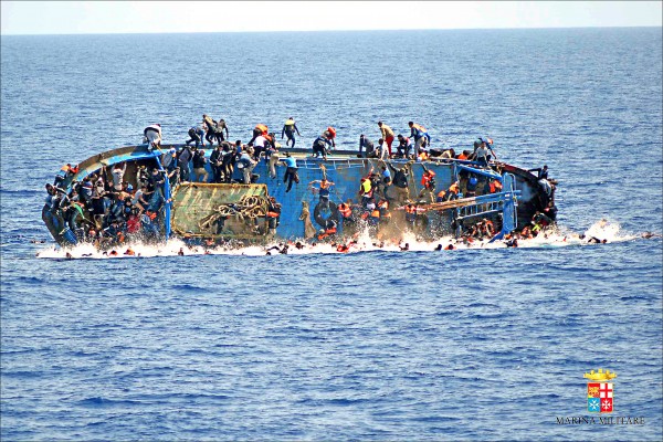 義大利海軍25日在利比亞外海救援即將翻覆的難民船。聯合國估計,近數日發生在地中海的難民船船難可能造成至少700人喪生,更有估計指罹難人數可能多達900人。(法新社檔案照)